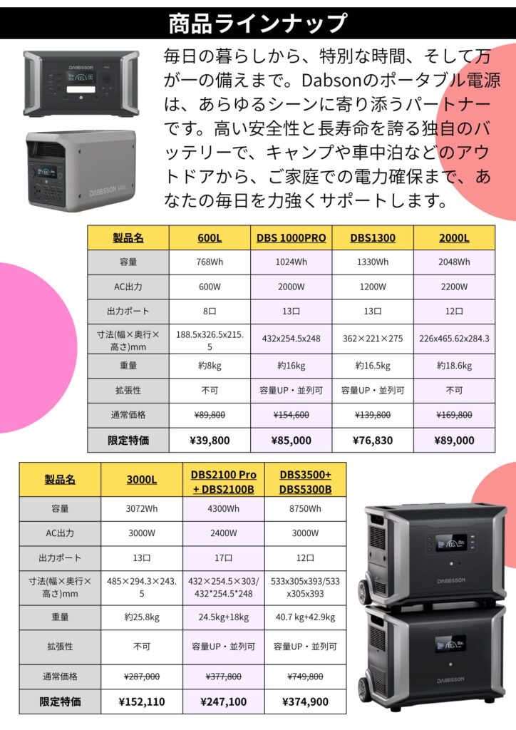 ダブソンは、高機能でパワフルなポータブル電源を提供しています。キャンプ、車中泊、災害時の備えなど、様々なシーンで活躍するモデルを取り揃えています。